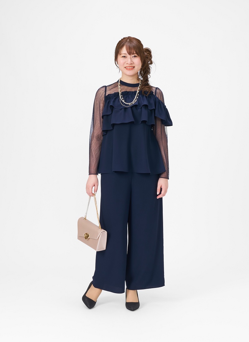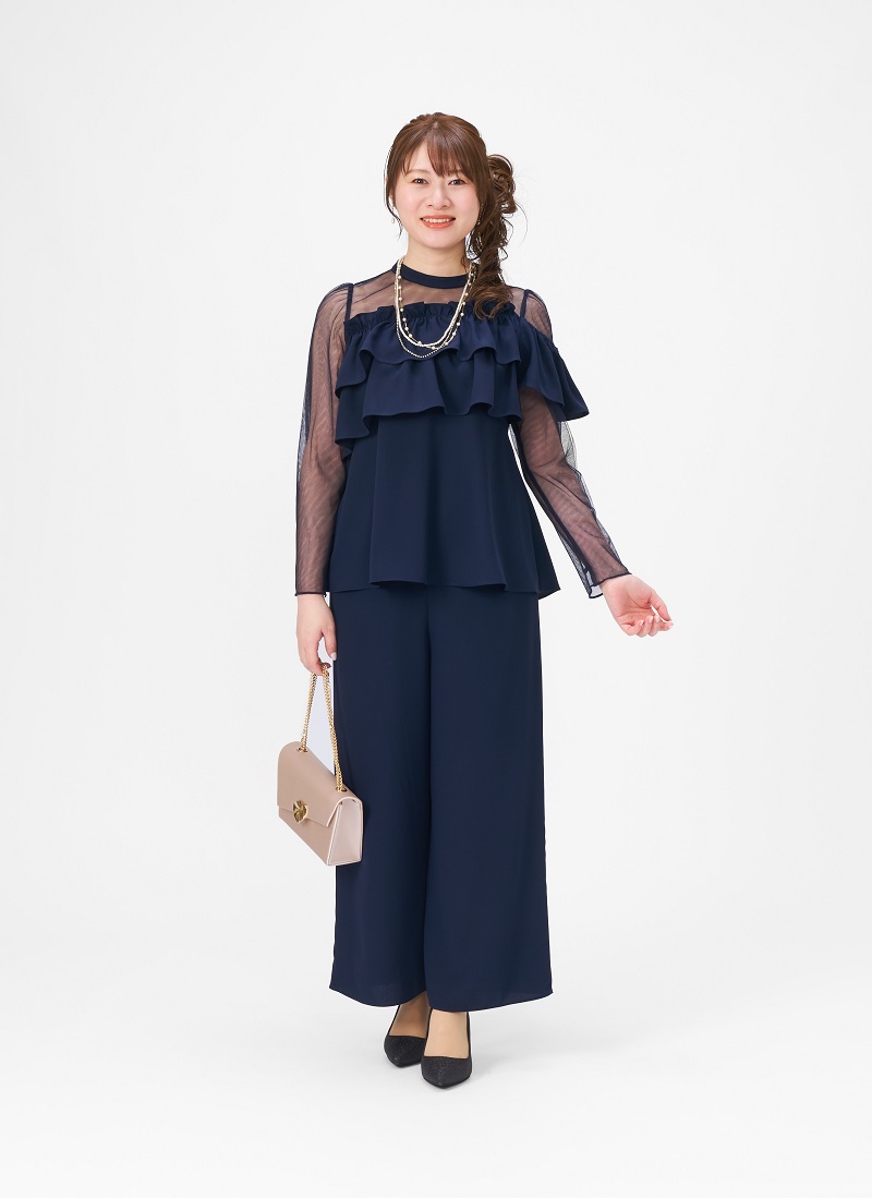 女性らしいフリルトップスをパンツでこなしたセットスーツはブライダルシーンからお食事会まで幅広いシーンで大活躍♪
