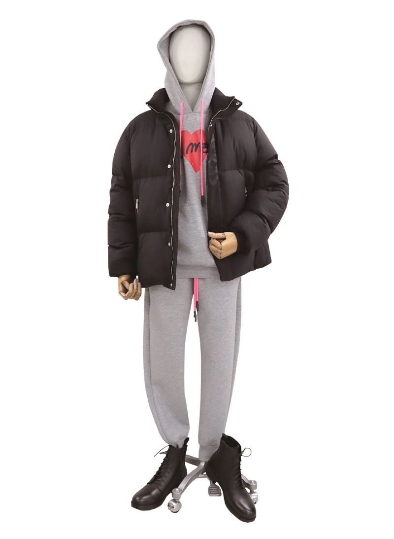 ゆるりとしたスウェットセットアップにプレミアムなダウンを纏ってラグジュアリーな休日の装い。