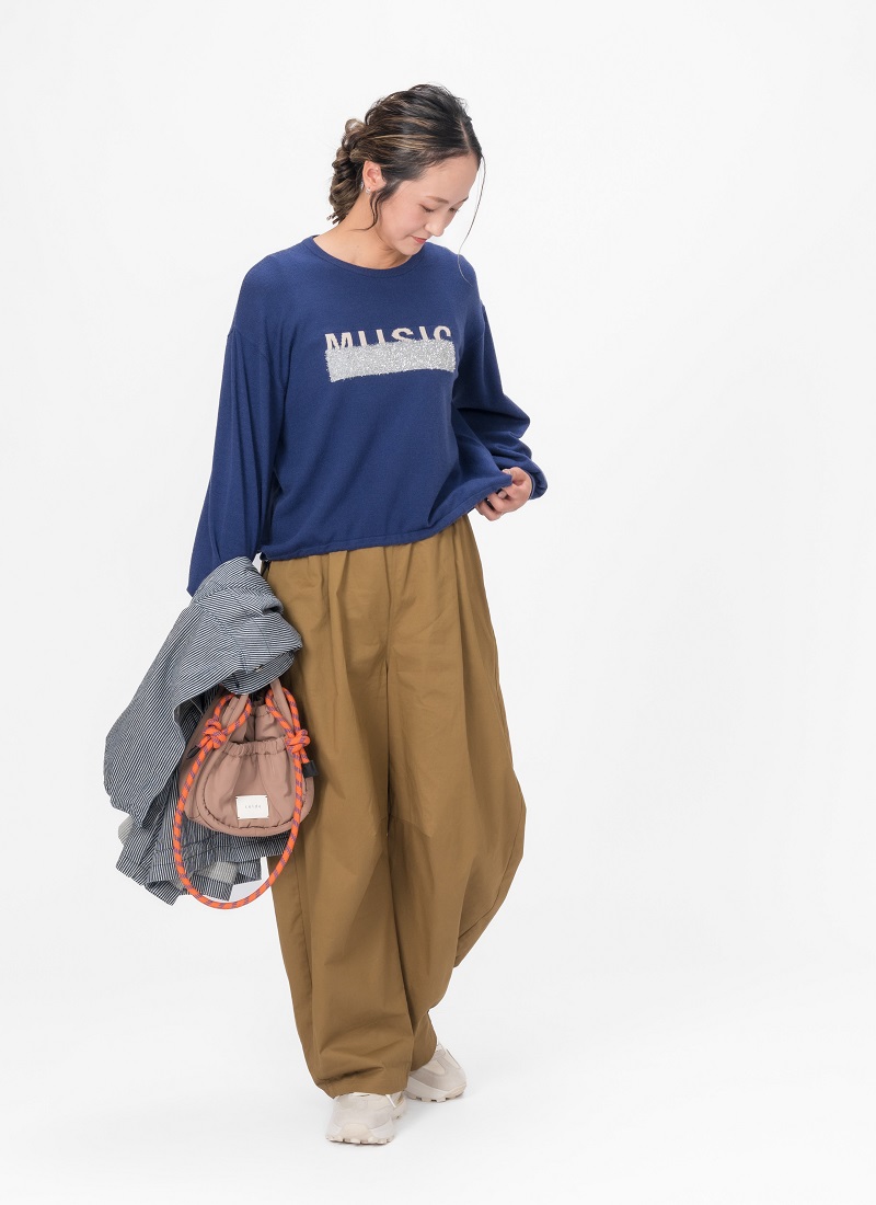 ラメロゴがかわいいニットは、コクーンパンツをあわせて遊びをプラス+☆