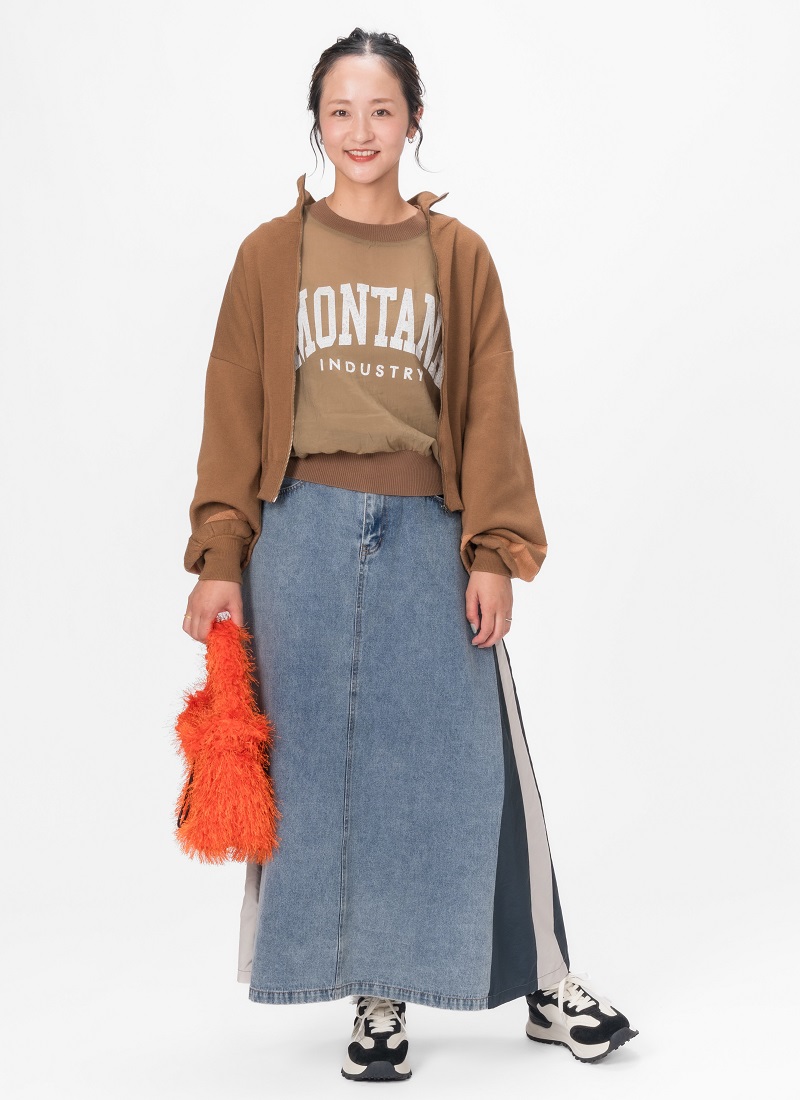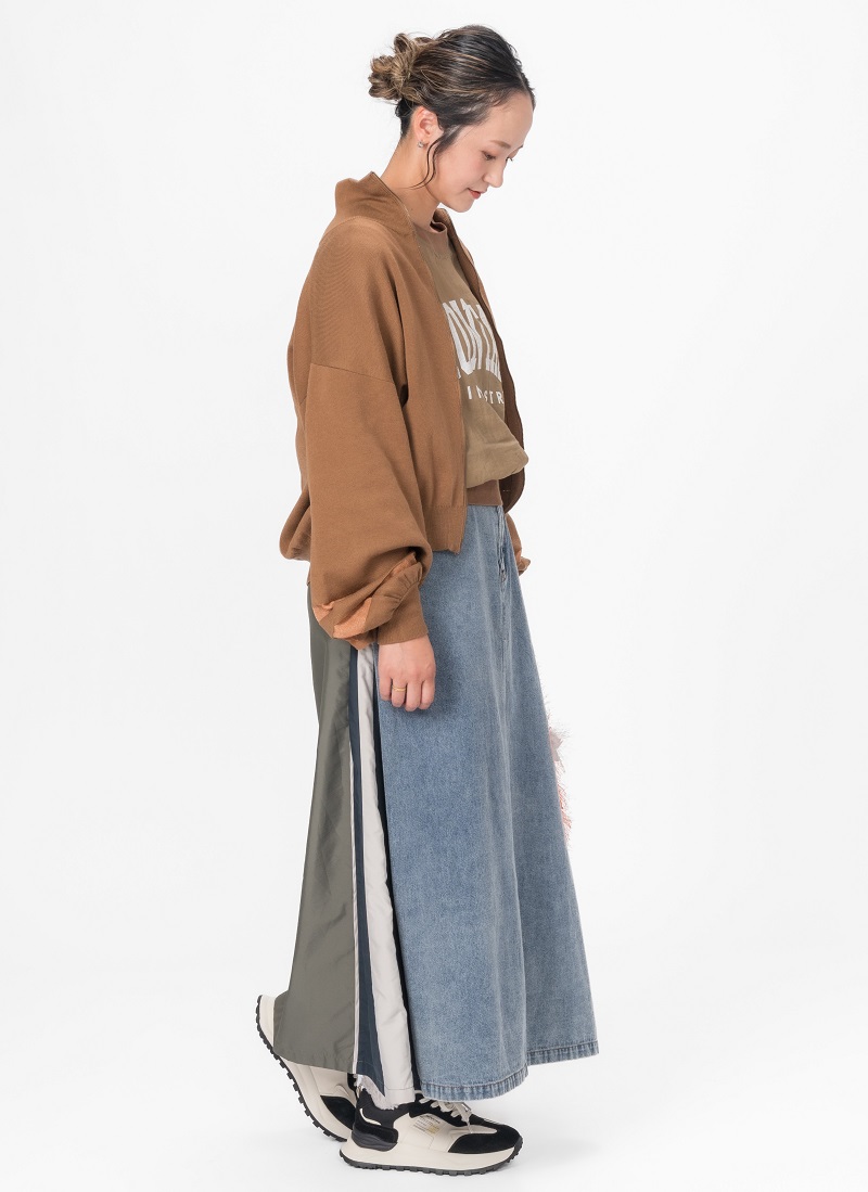 袖にシアーラインが入ったニットブルゾンは、インナーのカレッジロゴをポイントに、デニム×異素材切替のスカートでモードカジュアルに着るのがこの秋はオススメ!